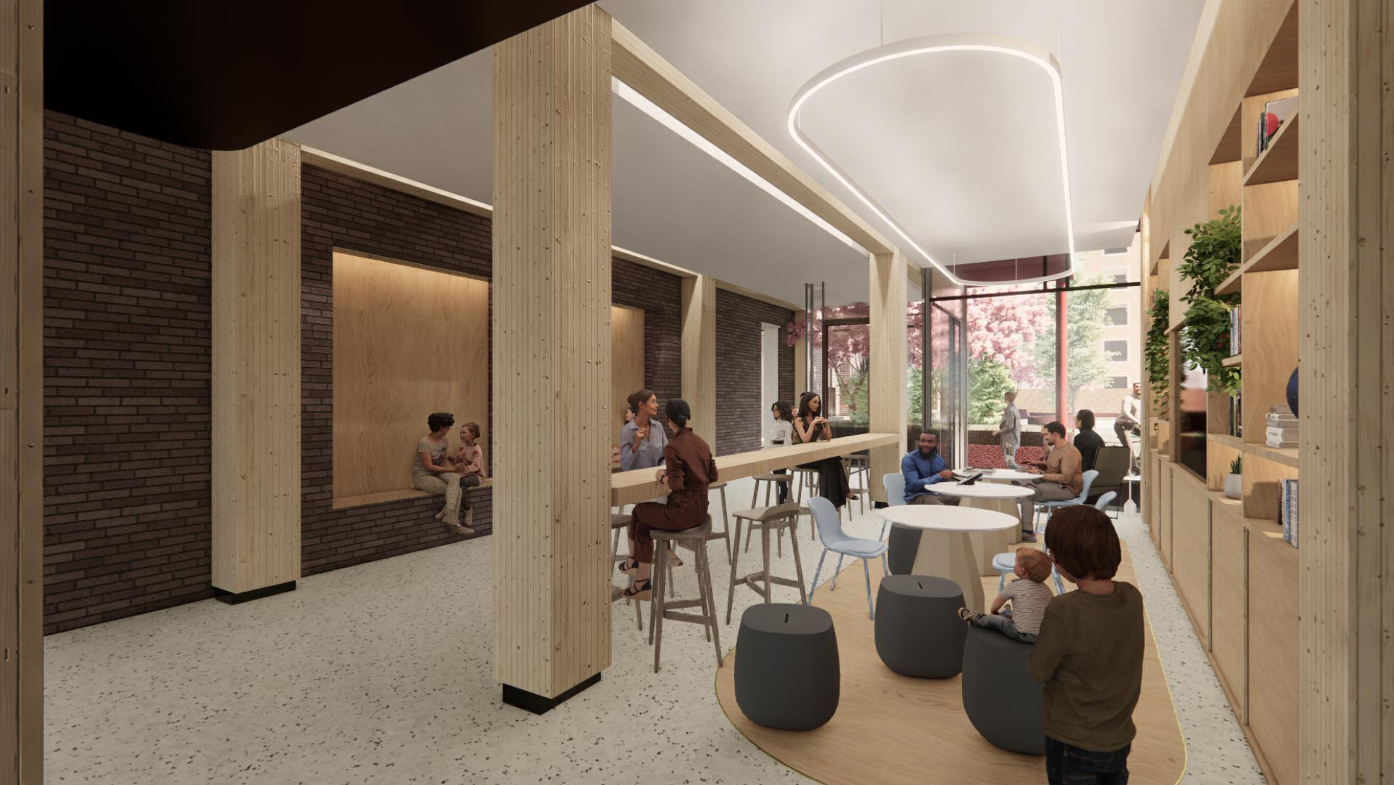 - An open, inviting ground-level community space includes an indoor play area for kids, a gym and lounge space, and a co-working area for the community to enjoy.